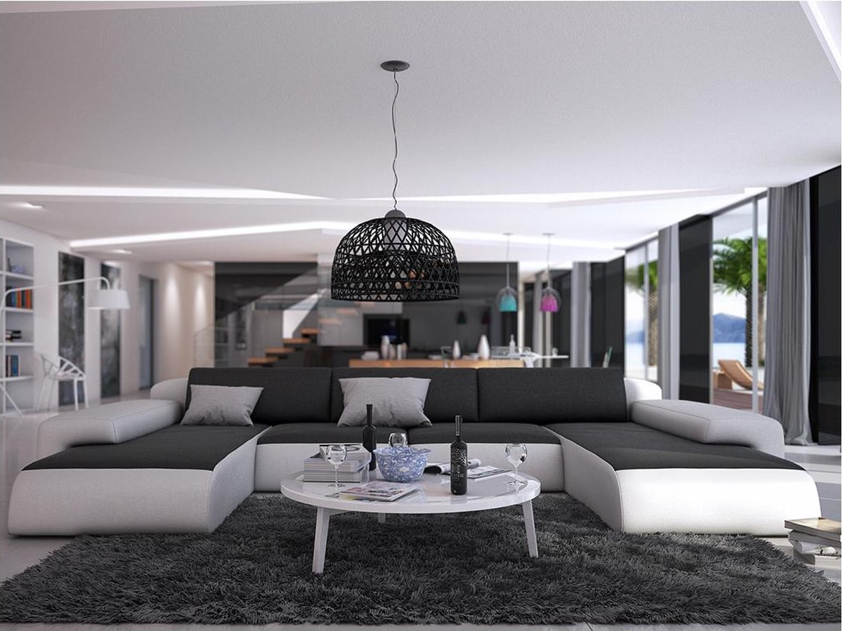 Bekijk goed in welke hoek van de kamer je de hoekbank geplaatst wilt hebben. XXL zevenzitsbank van kunstleer SICILE tweekleurig en antraciet L 400 cm x H 70 cm x D 250 cm kan geplaatst worden.